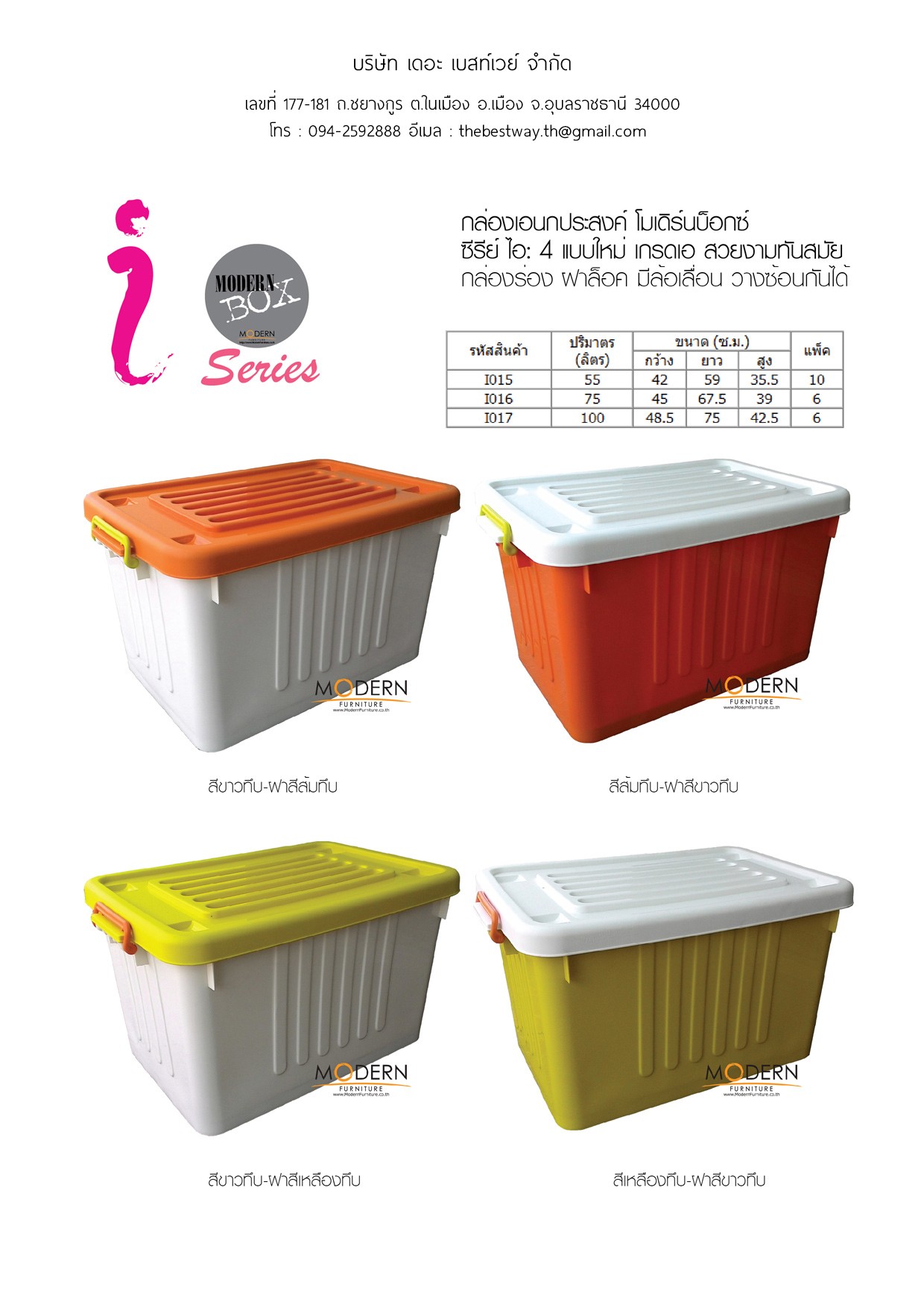 - มีให้เลือกหลายขนาดตามความต้องการ ทั้งเกรดเอและบี หลากสีสัน รหัสสินค้า | ปริมาตร | (ลิตร) ขนาด (ซ.ม.) | แพ็ค | กว้าง | ยาว | สูง | I015 | 55 | 42 | 59 | 35.5 | 10 | I016 | 75 | 45 | 67.5 | 39 | 6 | I017 | 100 | 48.5 | 75 | 42.5 | 6 | | |||||||