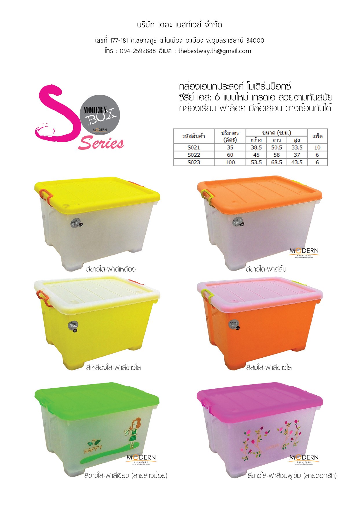 - มีให้เลือกหลายขนาดตามความต้องการ ทั้งเกรดเอและบี หลากสีสัน รหัสสินค้า | ปริมาตร | (ลิตร) ขนาด (ซ.ม.) | แพ็ค | กว้าง | ยาว | สูง | S021 | 35 | 38.5 | 50.5 | 33.5 | 10 | S022 | 65 | 45 | 58 | 37 | 6 | S023 | 100 | 53.5 | 68.5 | 43.5 | 6 | | |||||||