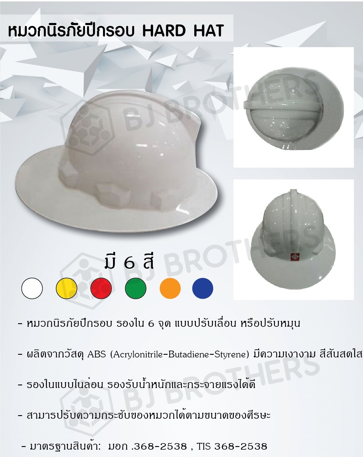 หมวกนิรภัยปีกรอบ HARD HAT ประเภท ปีกรอบนั้นเป็นหมวกที่ใช้เฉพาะด้าน เน้นการป้องกันสูงสุด เช่นการไฟฟ้าและดับเพลิง รองในหมวก ดูดซับแรงกระแทก 6 จุด