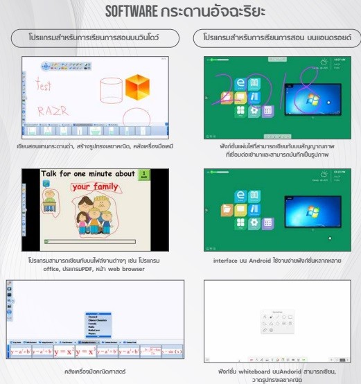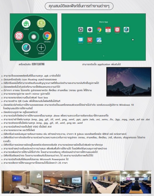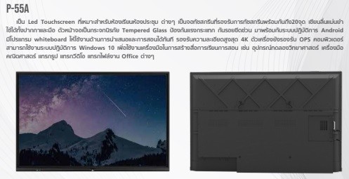 เป็น Led Touchscreen ที่เหมาะสำหรับห้องเรียน ห้องประชุม ต่างๆ เป็นจอทัชสกรีนที่รองรับการทัชสกรีนพร้อมกันถึง20จุด เขียนลื่นแม่นยำใช้ได้ทั้งปากกา และมือ ตัวหน้าจอเป็นกระจกนิรภัย Tempered Glass ป้องกันแรงกระแทก กันรอยขีดข่วน มาพร้อมกับระบบปฎิบัติการ Android มีโปรแกรม whiteboard ให้ใช้งานด้านการนำเสนอและการสอนได้ทันที รองรับความละเอียดสูงสุด 4K ตัวเครื่องยังรองรับ OPS คอมพิวเตอร์สามารถใช้งานระบบปฎิบัติการ Windows 10 เพิ่อใช้งานเครื่องมือในการสร้างสื่อการเรียนการสอน เช่น อุปกรณ์ทดลองวิทยาศาสตร์ เครื่องมือคณิตศาสตร์ แทรกรูป แทรกวีดิโอ แทรกไฟล์งาน office ต่างๆ